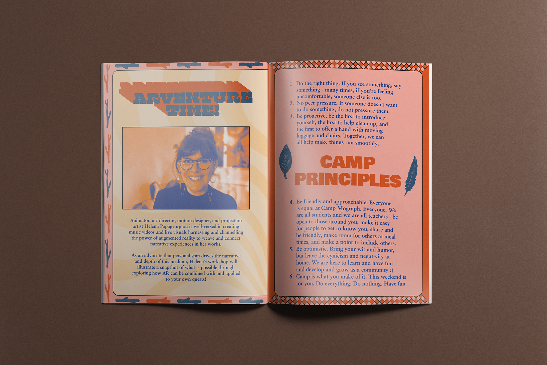 Each year, attendees at Camp Mograph receive a swag bag upon checking in to the event, and one of the most important items included inside is the Zine. More than just a fun community project, it's the handbook and guide that they will refer to throughout the event.